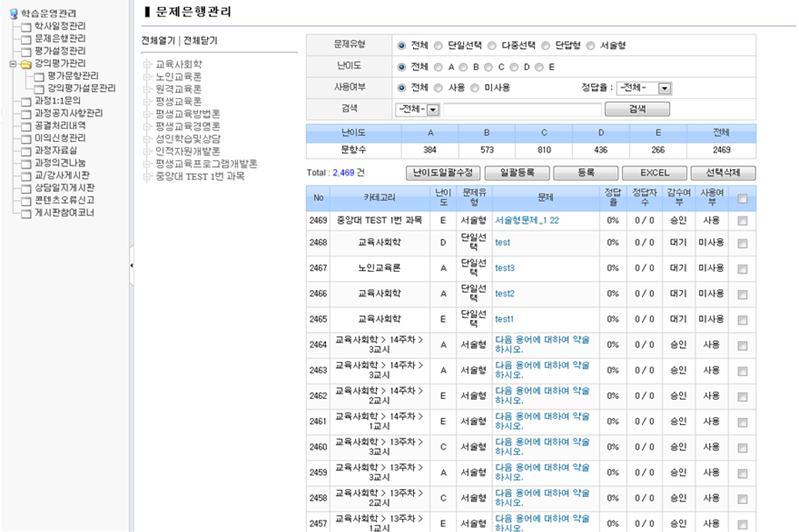 2013~2014년간 근무한 곳에서 개발한 LCMS 문제은행 사이트. 약 15곳의 학점은행제 사이트를 서비스 하였으며, 운영하는데 있어 필요한 기능들을 개발하고 운영중에 발생하는 문제점들을 처리, 유지보수