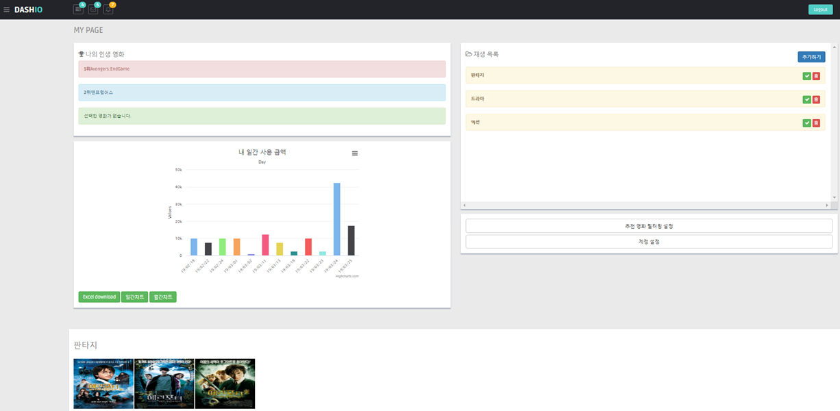 유저에게는 넷플릭스나 왓챠와 같이 사용자가 영상을 시청하면 시청한 영화와 비슷한 성격의 영상을 분석하여 메인에 출력해주며 ,관리자 쪽에서는 영상마다 기간별 매출정보를 분석하여 그래프로 매출을 예측해주는 기능으로 수익률을 높일 수 있는 사이트를 개발